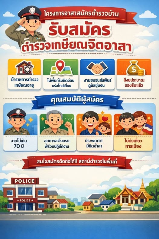 ด้วยสถานีตำรวจภูธรเมืองเพชรบุรี มีความประสงค์เปิดรับสมัครข้าราชการตำรวจที่เกษียณอายุราชการแล้ว เข้าร่วมโครงการ “ตำรวจเกษียณจิตอาสา” เพื่อร่วมเป็นกำลังสำคัญในการช่วยเหลือราชการ ดูแลชุมชน และเสริมสร้างความเข้มแข็งด้านความปลอดภัยในพื้นที่ โดยอาศัยองค์ความรู้ ความชำนาญ และประสบการณ์ในการปฏิบัติงานของข้าราชการตำรวจที่สั่งสมมาอย่างยาวนาน