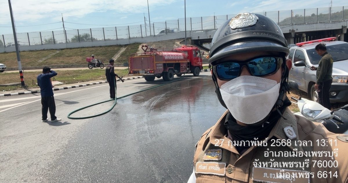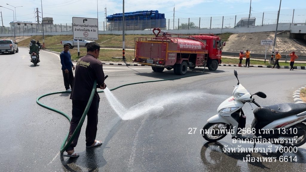 วันที่ 27 ก.พ.68 เวลา 13.20 น. เมืองเพชร 6614 พร้อมรถฉีดน้ำบ้านหม้อ ว.4 ฉีดชำระล้างผิวถนน