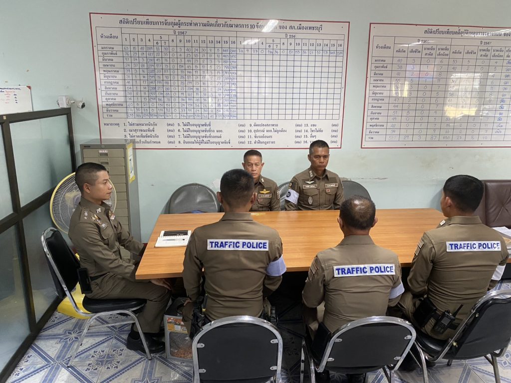 วันนี้ 10 มีนาคม 2568 เวลา 14.00 น. พ.ต.ท.ชาญยุทธ พวงสั้น รอง ผกก.จร.สภ.เมืองเพชรบุรี พ.ต.ท.ศักดิ์ระพี พูลพิพัฒน์ สว.จร.สภ.เมืองเพชรบุรี พร้อมด้วยร้อยเวร 60 ทุกนาย ร่วมประชุมเพื่อชี้เเจงข้อราชการและแนวทางการปฏิบัติในการจัดการ บริหารและแก้ไขปัญหาการจราจรในพื้นที่รับผิดชอบ สภ.เมืองเพชรบุรี