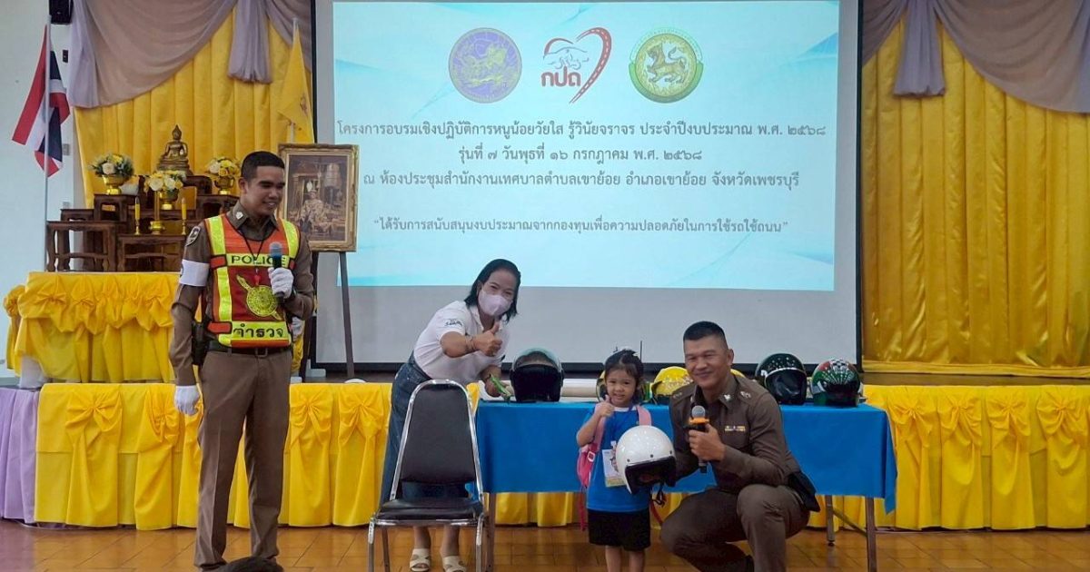 วันนี้ 16 ก.ค. 2568 เวลา 09.30 น. พ.ต.ต.กดชา บรรเทิงจิต สวป.(ชส)สภ.เมืองเพชรบุรี ว.4 วิทยากรโครงการ อบรมปฏิบัติการหนูน้อยวัยใส รู้วินัยจราจร รุ่นที่ 7 ณ ห้องประชุม สำนักงาน เทศบาลตำบลเขาย้อย อำเภอเขาย้อยจังหวัดเพชรบุรี