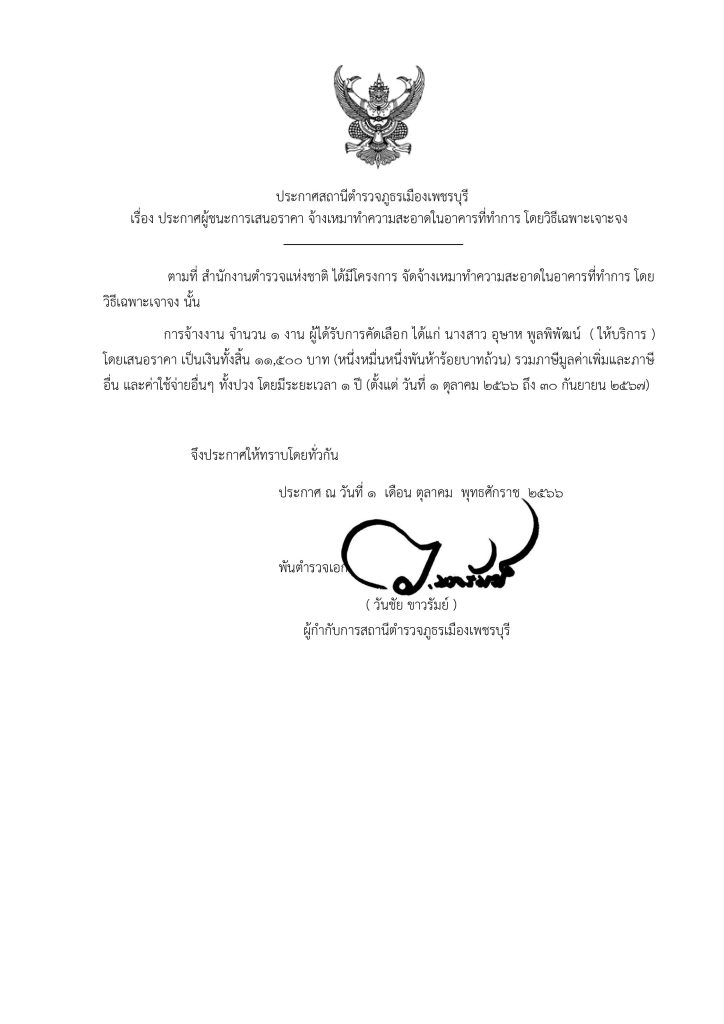 สภ.เมืองเพชรบุรี ประการผู้ชนะการเสนอราคา จ้างเหมาทำความสะอาดในอาคารที่ทำการ โดยวิธีเฉพาะเจาะจง