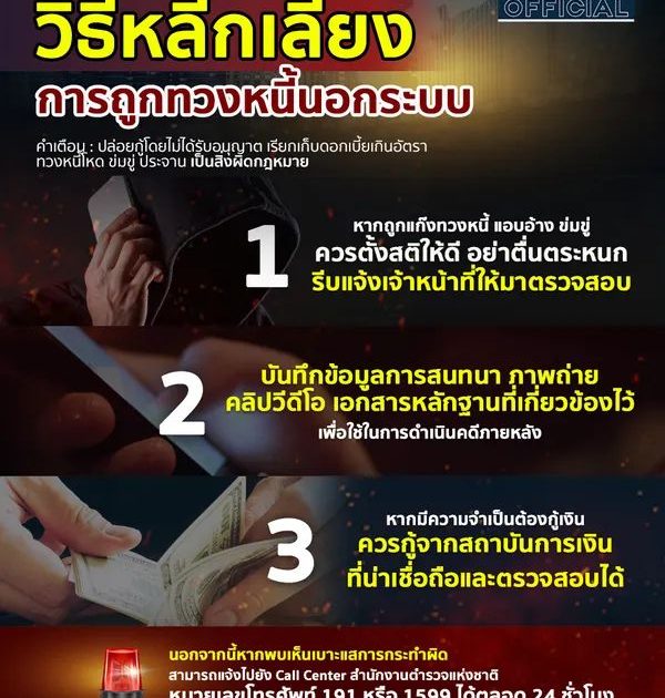 สภ.เมืองเพชรบุรี ประชาสัมพันธ์วิธีหลีกเลี่ยงการถูกทวงหนี้นอกระบบ หากพบเบาะแสการกระทำผิด 📌สามารถแจ้ง Call Center สำนักงานตำรวจแห่งชาติ หมายเลขโทรศัพท์ 191 หรือ 1599 ได้ตลอด 24 ชั่วโมง