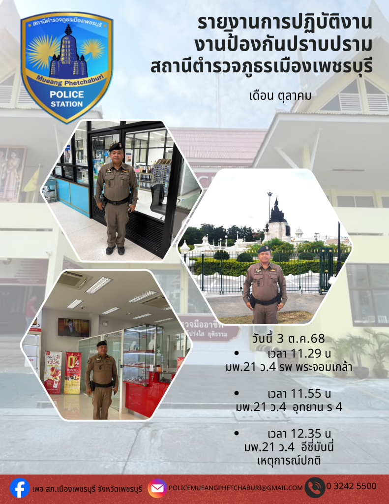 สภ.เมืองเพชรบุรี วันที่ 3 ต.ค.68 พ.ต.ท.โย บัวบาน สวป.สภ.เมืองเพชรบุรี ว.4 ตรวจ รพ.พระจอมเกล้า อุทยาน ร.4 โรงรับจำนำ อีนี่มันนี่ เหตุการณ์ปกติ