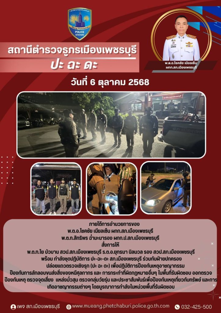 สภ.เมืองเพชรบุรี วันที่ 6 ตุลาคม 2568 ชุด ปะฉะดะ สภ.เมืองเพชรบุรี ร่วมกับฝ่ายปกครองปล่อยแถวตรวจเชิงรุก เพื่อป้องกันอาชญากรรม