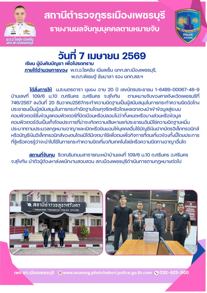 สภ.เมืองเพชรบุรี วันที่ 7 เม.ย.69 งานสืบสวน รายงานผลจับกุมบุคคลตามหมายจับ