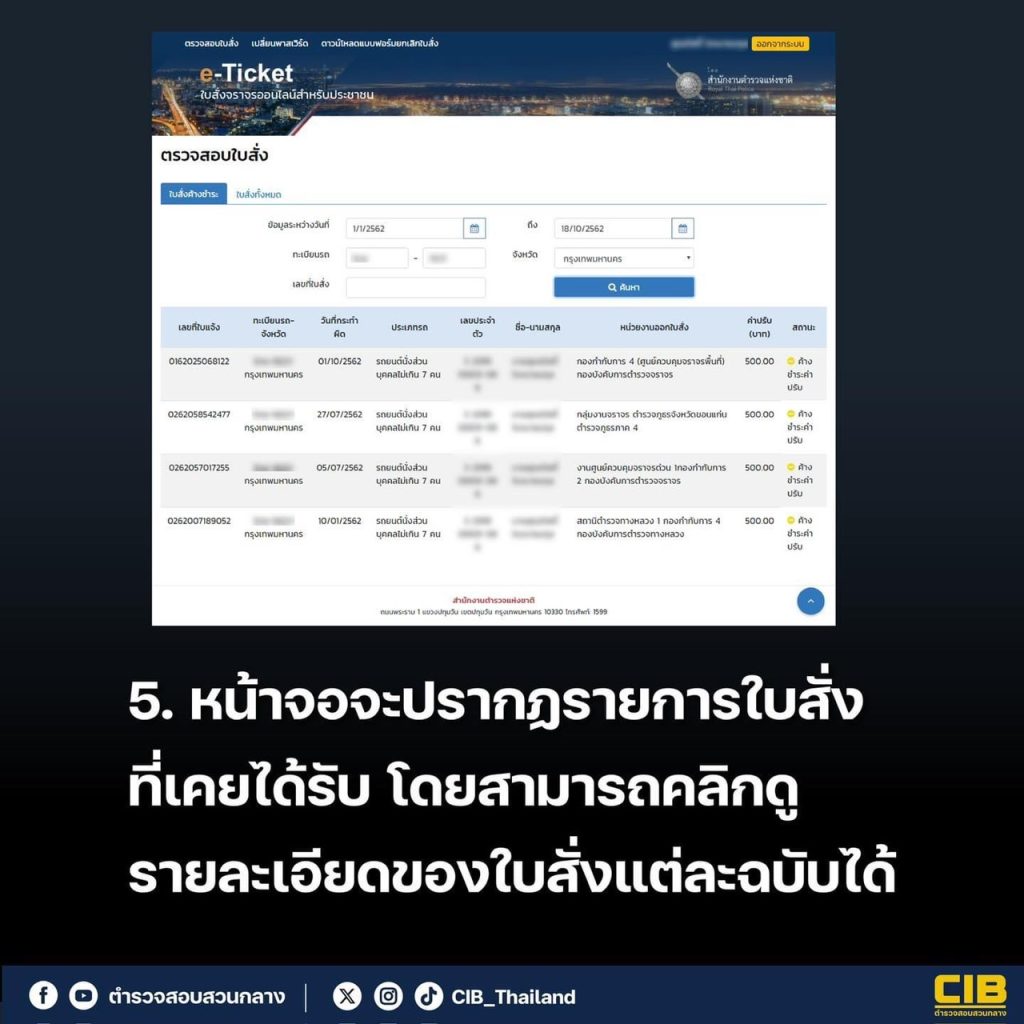 4. ค้นหาใบสั่งโดยระบุวันที่กระทำผิด จากนั้นกดปุ่ม “ค้นหา” (สามารถกรองข้อมูลด้วยเลขทะเบียนรถหรือหมายเลขใบสั่งได้)