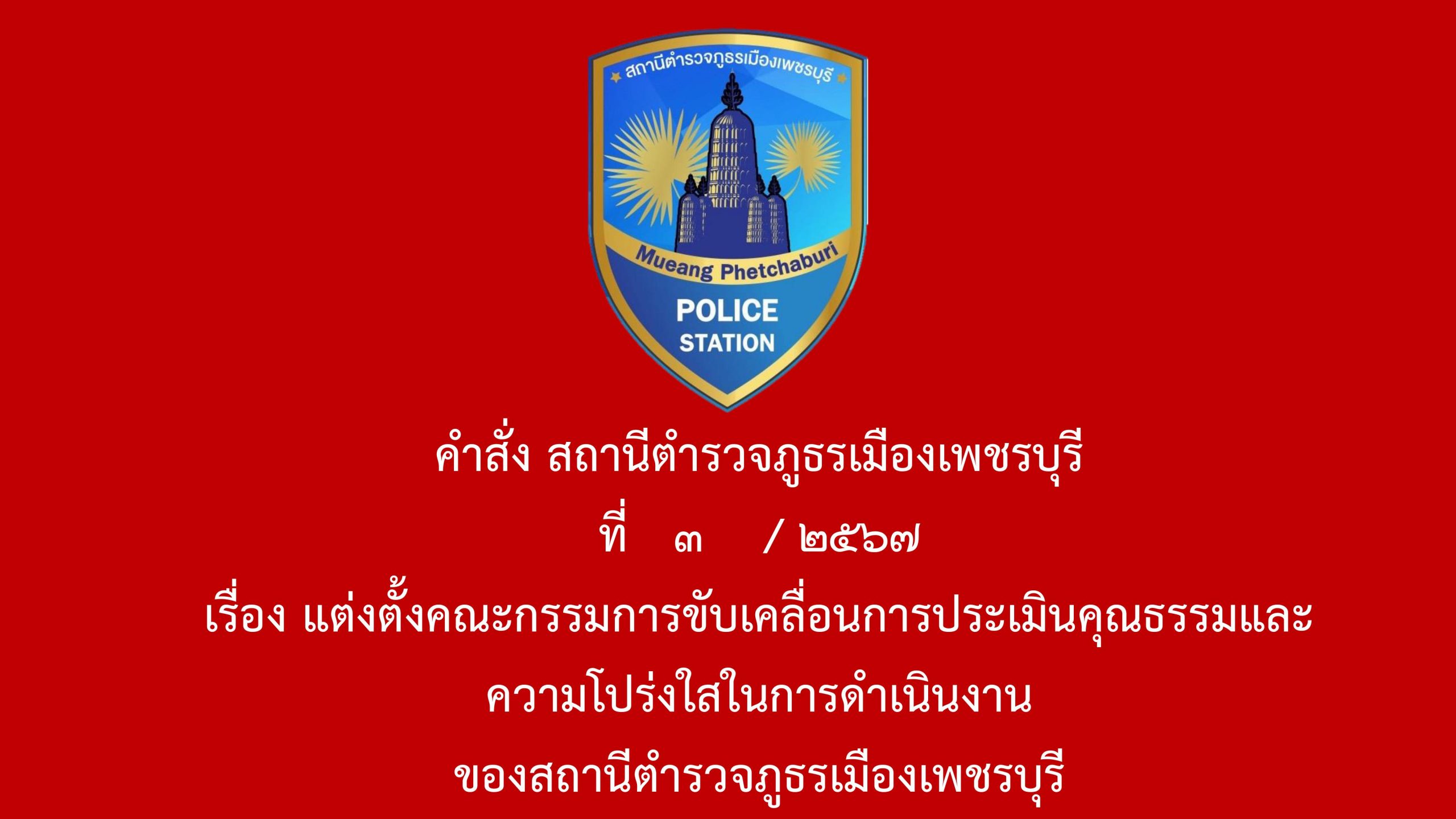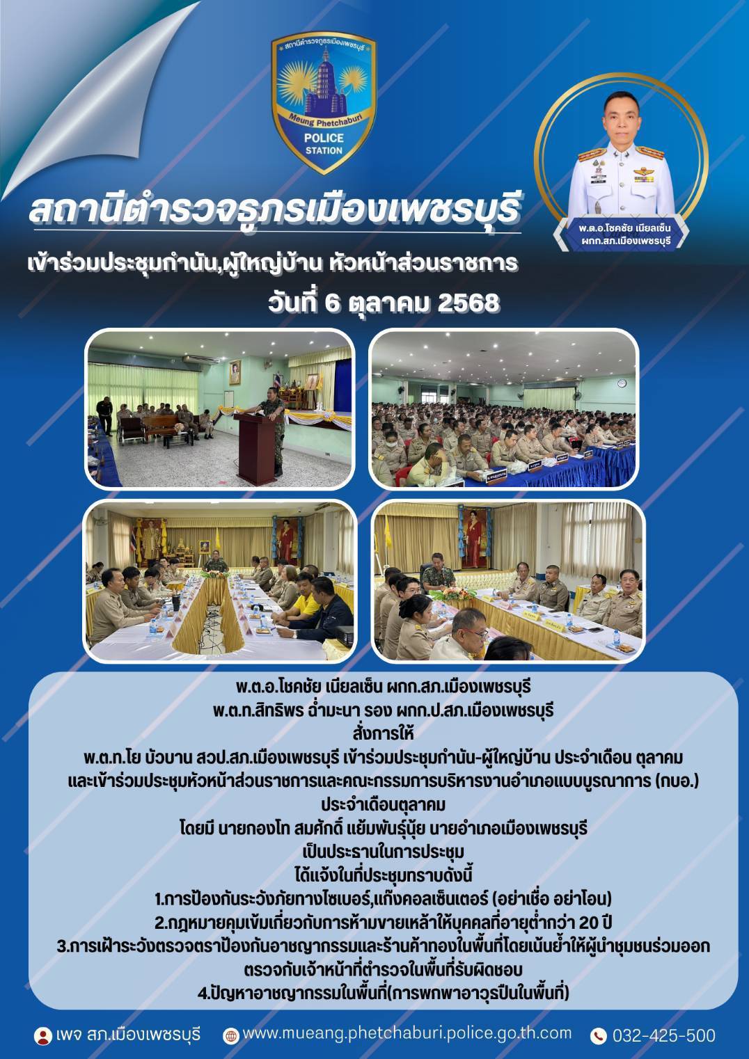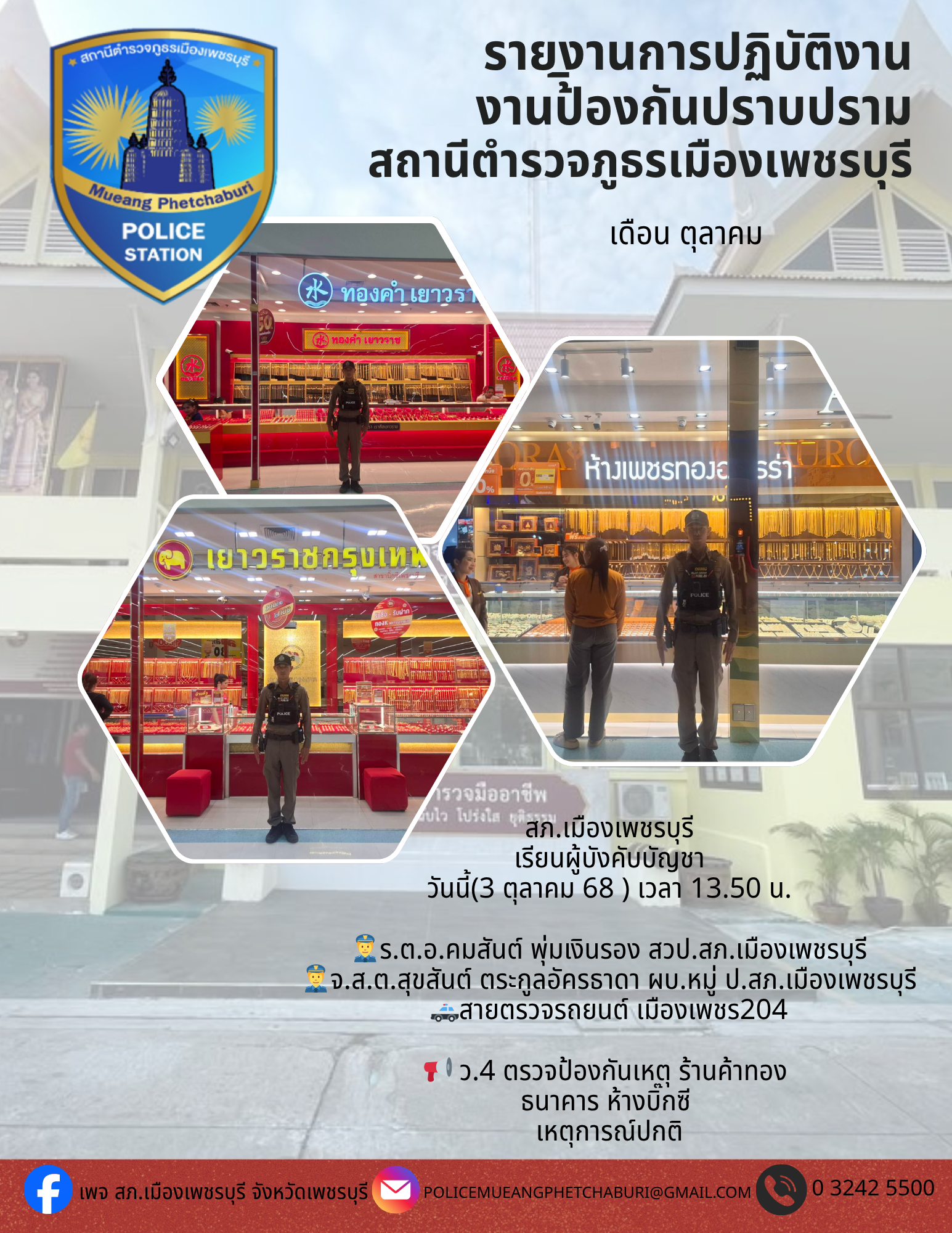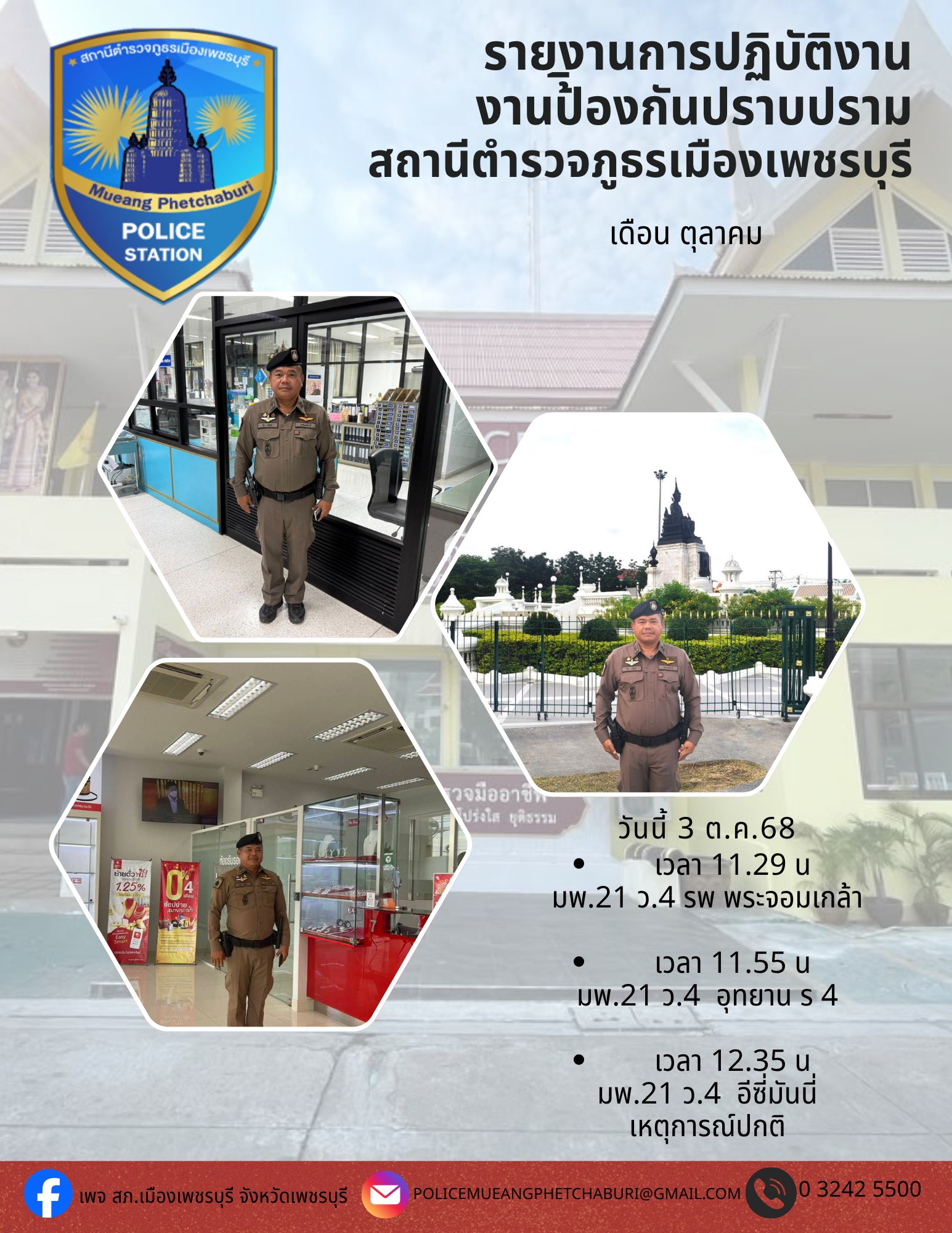 สภ.เมืองเพชรบุรีเรียน ผู้บังคับบัญชา เพื่อโปรดทราบ ภายใต้อำนวยการของ พ.ต.อ.โชคชัย เนียลเซ็น ผกก.สภ.เ