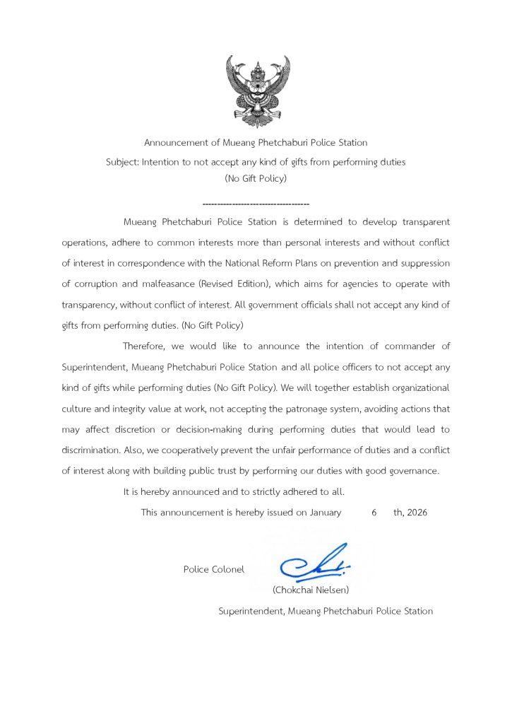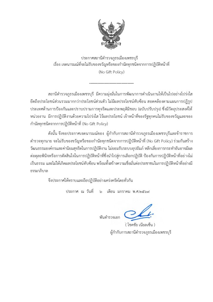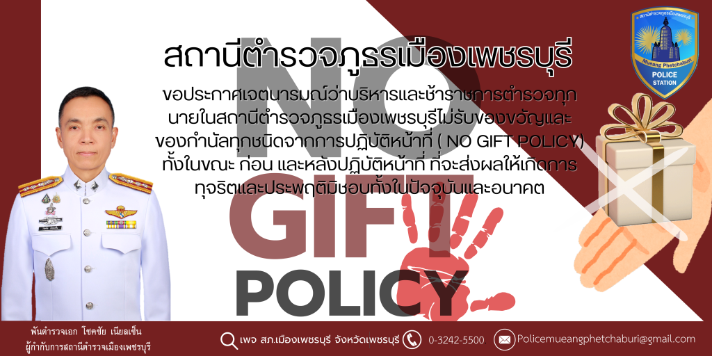 ประกาศ สถานีตำรวจภูธรเมืองเพชรบุรี เรื่อง เจตนารมณ์จะไม่รับของขวัญหรือของกำนัลทุกชนิดจากการปฏิบัติหน้าที่ ( NO GIFT POLICY )